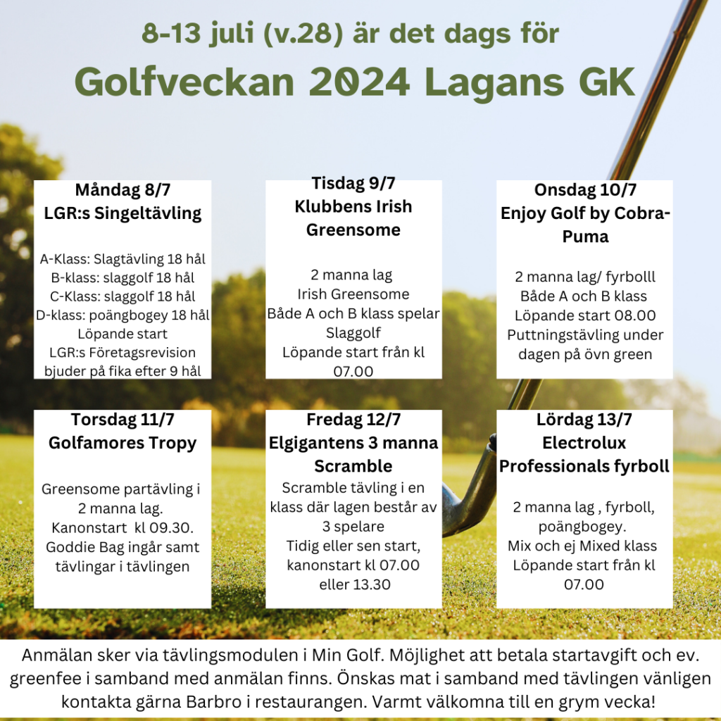 Tävlingarna under golfveckan är nu släppta, logga in på min golf och anmäl er. Golfveckan är som vanligt V.28 mellan den 8 och 13 Juli.